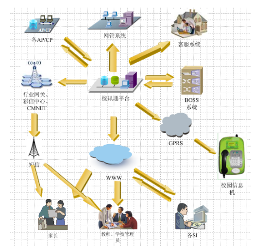 业务系统主要由中国移动网络平台(包括移动行业网关、彩信中心、cmnet、boss系统、客服系统、网管系统等)、和校园系统平台、用户(包括学校、老师、家长、学生)三部分组成。和校园平台通过自建平台为中小学、幼儿园提供相关功能服务及以AP形式接入的和校园大学版服务。平台支持以AP/CP形式接入并为用户提供相应教育服务。